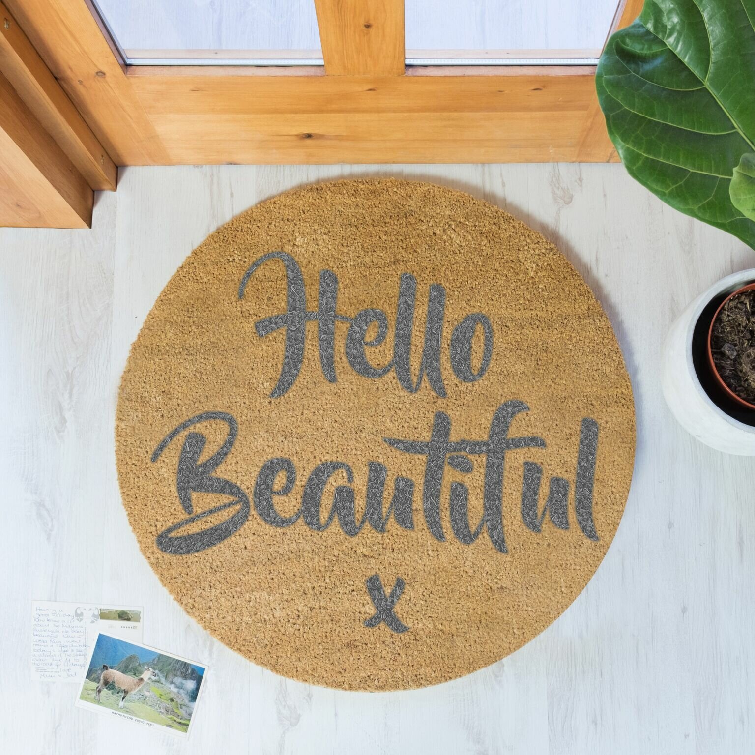 Welcome your guests to your home with our adorable Grey Circle Hello Beautiful Door Mat.