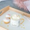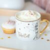 These unique White mugs each have a metallic Gold finish around the rim and the handle. They are also finished with their name on the sides.